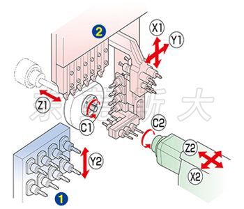 | 五、斯大走心機了進一步實現多樣化復合加工,充實了背面側的功能,從而在背面刀架臺配備8軸鉆孔單元,并搭載Y2軸滑動部采用燕尾槽構造,提高背面刀架臺的剛性。 | |||