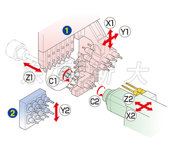 | 五、斯大走心機SR-20JIItypeB正面配備2軸深孔套筒座,可鉆最大加工直徑φ8mm深度100mm的深孔,實現特殊深孔的可行性解決方案,為了進一步實現多樣化復合加工,充實了背面側的功能,從而在背面刀架臺配備8軸鉆孔單元,并搭載Y2軸滑動部采用燕尾槽構造,提高背面刀架臺的剛性。 | |||